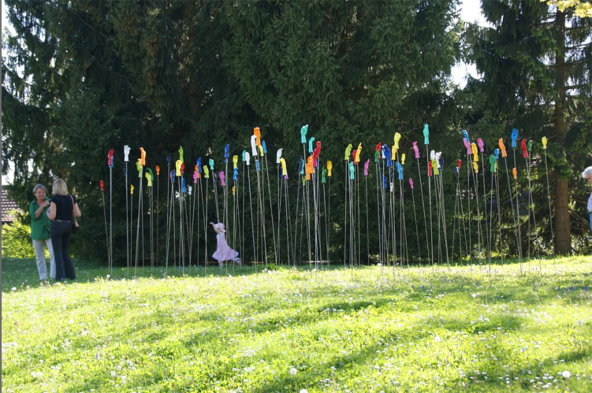 Im Jahr 1982 gab es in Stäfa eine Ausstellung der Stäfner Künstler, wo auch ich mich mit dieser Aussen- Installation beteiligte. Damals waren es 100 grosse Flusskiesel, und sie standen ganz gerade in der Wiese. Anlässlich dieser Ausstellung wurden sie verkauft, und wurden in einen Garten in der Umgebung versetzt.